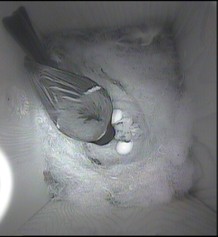 All six chicks are still in the box. They spent the night by themselves for the first time. The sun is shining today for the first time in ages and the parent birds are making vaiant attempts to get the chicks out of the nest box. Tempting food is brought to the mouth of the box and the chicks are able to fly to the mouth but lack the courage to leave. The parent birds eventually bring some food into the nest box.