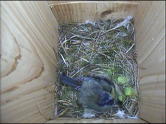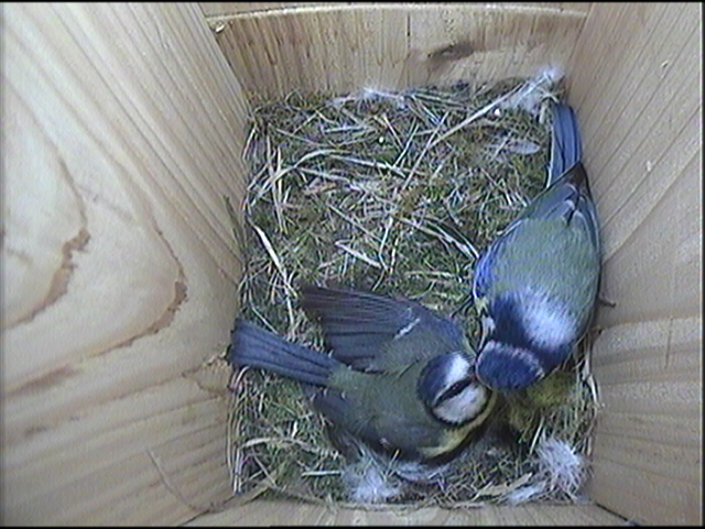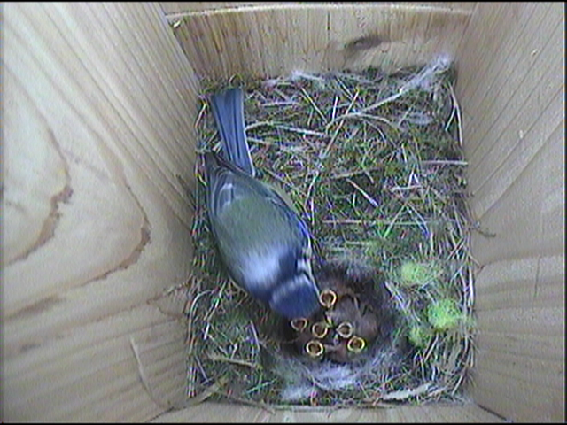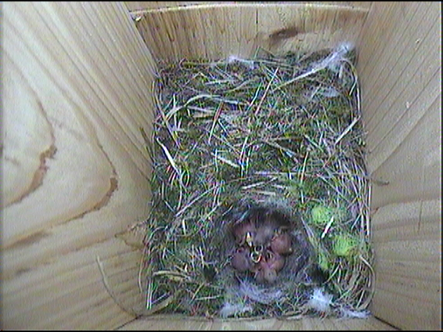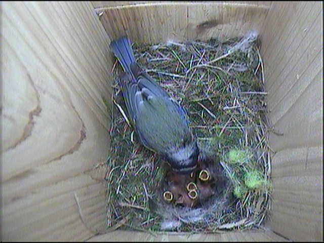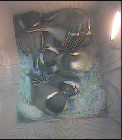 All six chicks are still being fed by both parents, albeit reluctantly. Both parents have been trying to tempt the chicks to leave the nest box by offering caterpillars at the mouth of the box. The chicks respond by flapping their wings and creating a tremendous din. The parent bird eventually give in and enters the nest box to feed the young. The weather has picked up and is a perfect day to leave the nest box.