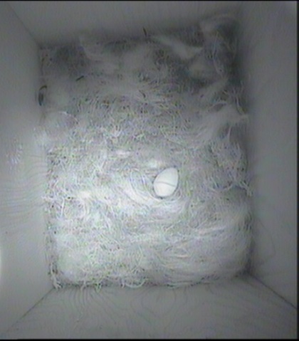 First egg in the nest box this morning – laid between 11:30pm and 6:00am. Picture quality is slightly fuzzy due to outside mist.